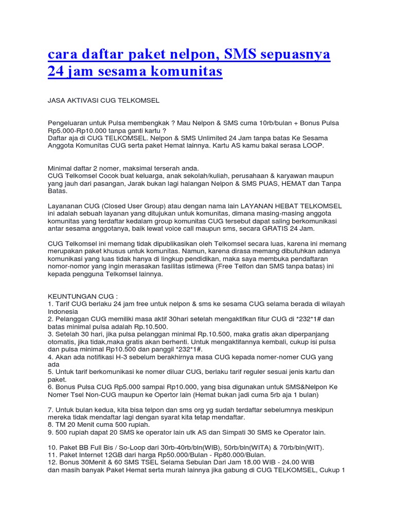 Bagaiman daftar cug telkomsel dan berapa biaya daftar paket cug.